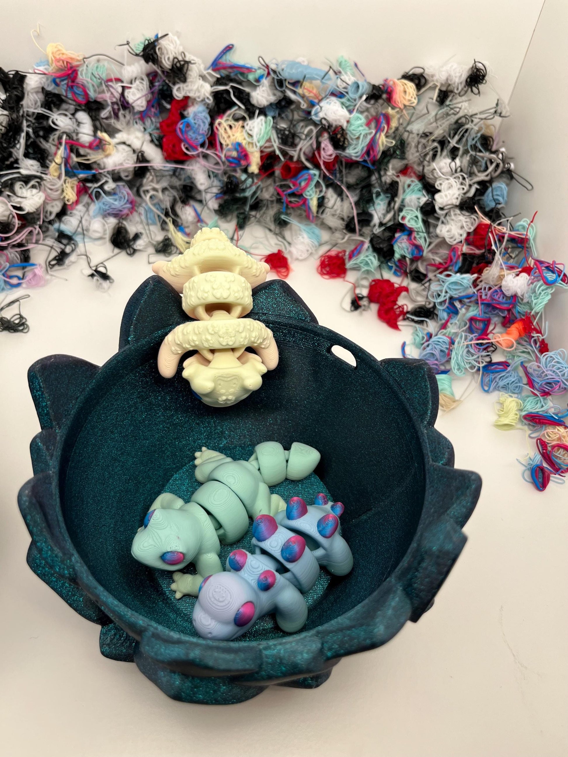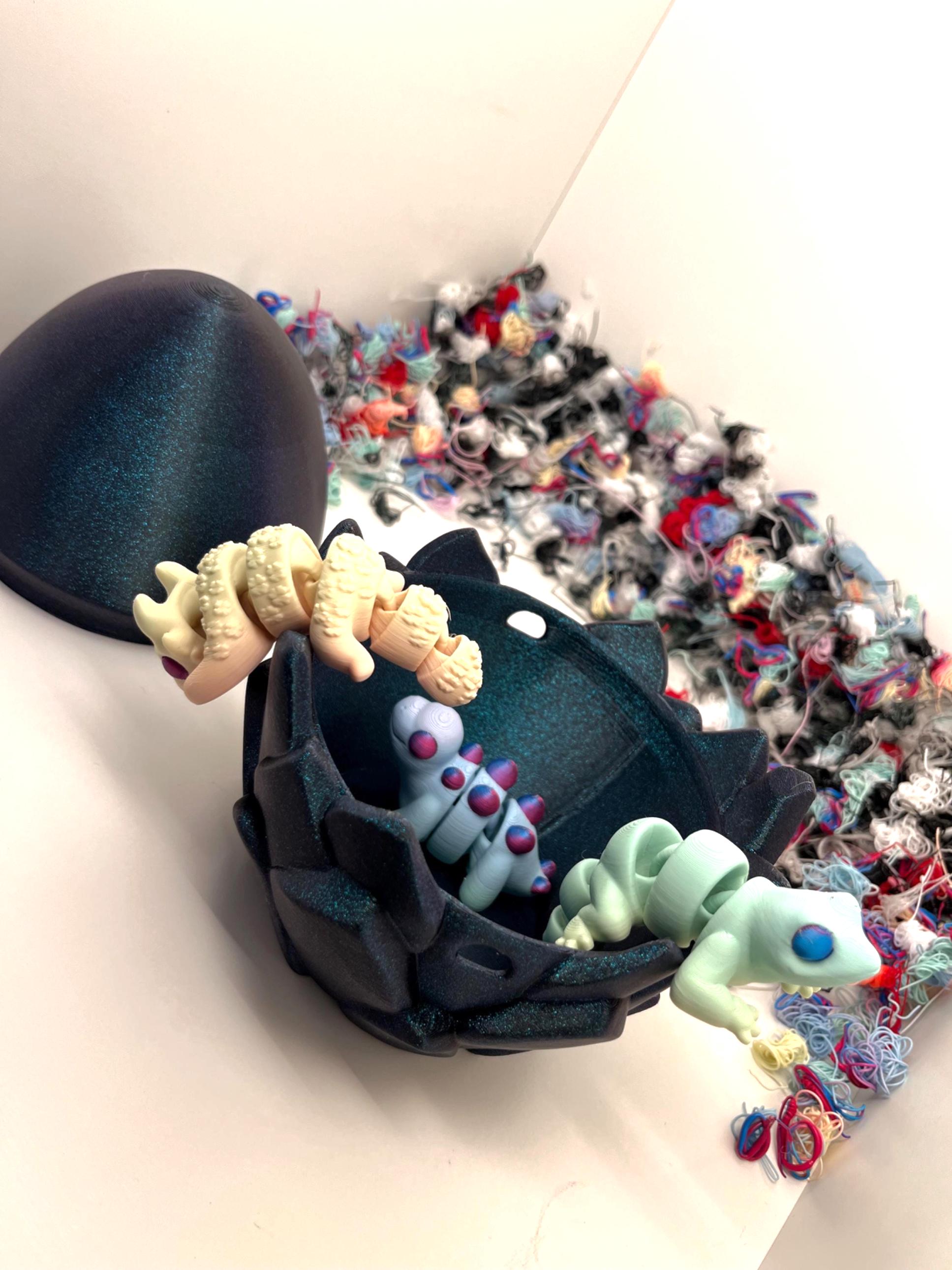 This impressive 3D printable set includes a huge, egg-shaped container with a matching base and lid—easily assembled after printing. Inside the egg, you'll find three adorable flexi animals: a beautifully ornamented dragon with floral patterns, a cute little dinosaur, and a charming lizard.