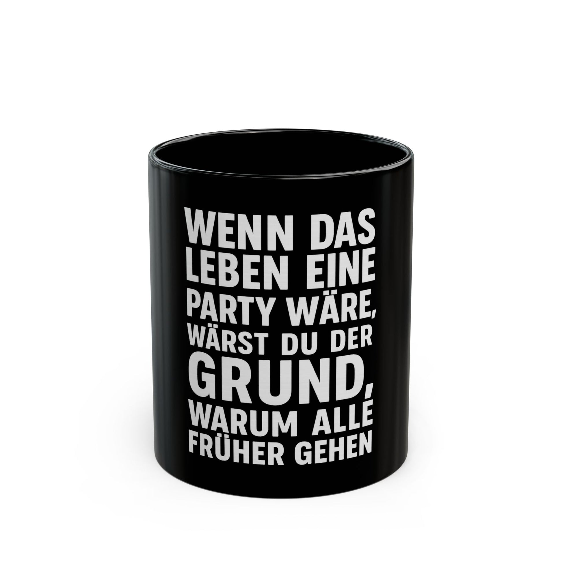 Der Spruch „Wenn das Leben eine Party wäre, wärst du der Grund, warum alle früher gehen“ sitzt in klarer, kontrastreicher weißer Typografie auf tiefschwarzer Glasur und sorgt dafür, dass jeder Schluck Kaffee oder Tee mit einer Portion Attitüde serviert wird.